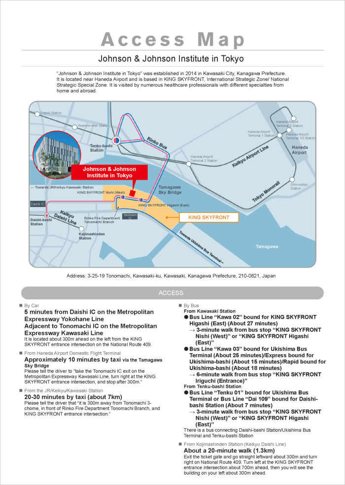 2014年に神奈川県川崎市に開設した「ジョンソン・エンド・ジョンソン インスティテュート 東京」は、羽田空港に近く、国際戦略総合特区・国家戦略特区でもあるキングスカイフロントを拠点として、国内外から幅広い診療科の医療従事者が訪れています。