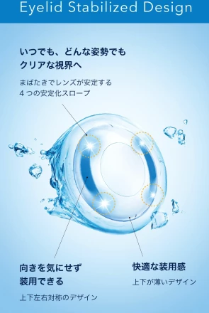 ジョンソン・エンド・ジョンソンは、まばたきの際のコンタクトレンズへの力のかかり方を分析し、どうすればレンズの向きをキープできるのか、まばたきに合わせて素早くレンズの向きが安定して適切に乱視を矯正し続けられるかを研究しました。乱視用の「アキュビュー® 」は、「アイリッド・スタビライズド・デザイン(Eyelid Stabilized Design)」というクリアで安定した視界をもたらす独自技術により、以下のような特長がある乱視用コンタクトレンズです。また、人の涙に似た保湿成分を配合し、快適なつけ心地も追求しています。