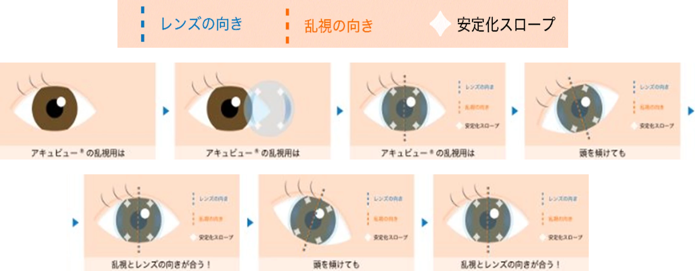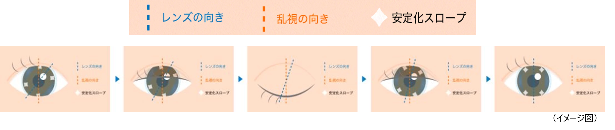 乱視は角膜や水晶体のゆがみが原因のため、人それぞれゆがみの方向に応じた乱視の軸(向き)が異なります。コンタクトレンズで乱視を矯正するには、乱視の方向とレンズの方向が正しく合う位置でレンズがとどまることが重要です。乱視の方向とレンズの方向がずれると、乱視用コンタクトレンズを装用していても視力が低下しぼやけて見えることがあります。