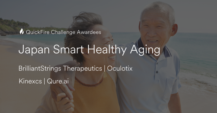 そして、私たちが目指す「スマート・ヘルシー・エイジング(いくつになっても健康で、豊かな人生を楽しむこと)」社会の実現の一助になるよう立ち上げたのが、人生100年時代の健康寿命延伸に貢献するヘルスケアイノベーションのインキュベーションを目指したビジネスコンテスト「クイックファイアー・チャレンジ(QFC)」です。
